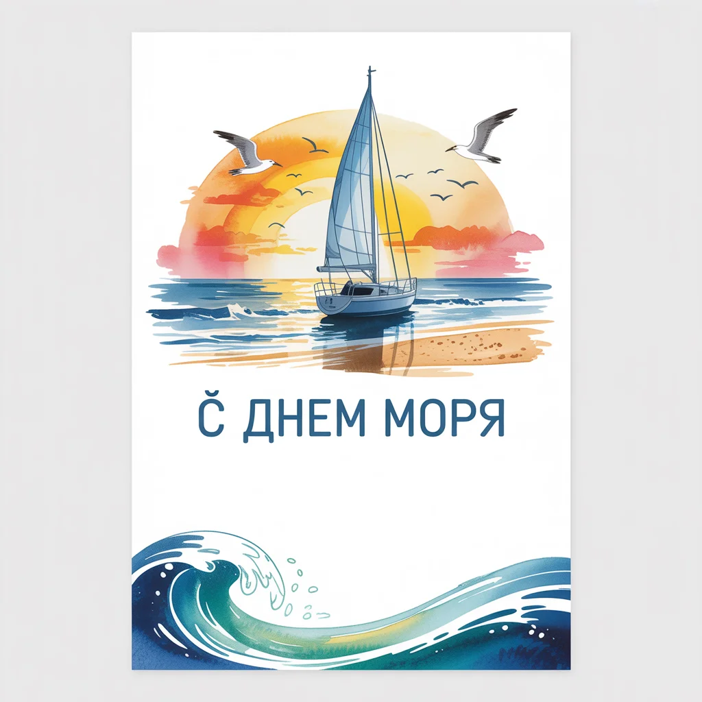 Открытки к этому празднику часто оформляют в морской палитре: оттенки синего, бирюзового и белого, изображения волн, парусов, маяков и якорей. Бумажные варианты могут содержать надписи вроде «Пусть море всегда будет добрым» или «С днём морских горизонтов», электронные — анимацию качающихся волн или пролетающих чаек. Их дарят морякам, любителям путешествий, друзьям и коллегам, связанным с морской тематикой. Такая открытка передаёт атмосферу простора и свежести, которую так ценят все, кто любит море.