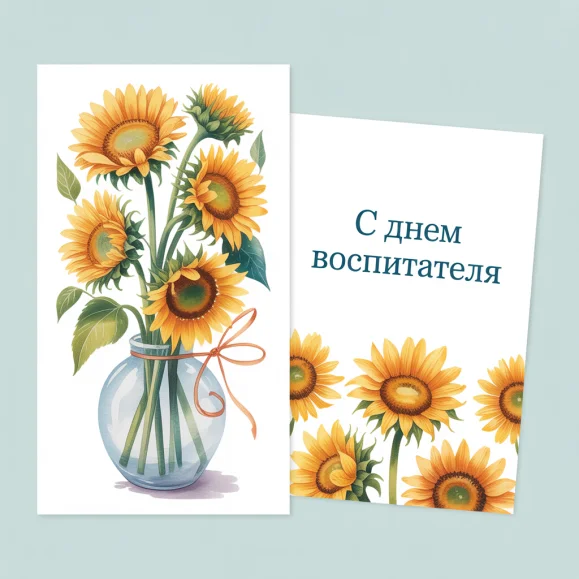 Открытки к этому празднику оформляют яркими и добрыми мотивами: детские рисунки, игрушки, цветы, солнечные лучи. Бумажные варианты могут содержать надписи вроде «Спасибо за тепло и заботу» или «С Днём воспитателя!», электронные — анимацию с играющими детьми или цветущими садами. Их дарят воспитателям, помощникам, музыкальным и физкультурным педагогам, чтобы выразить благодарность и признание. Такая открытка поднимает настроение и передаёт тёплую атмосферу праздника.